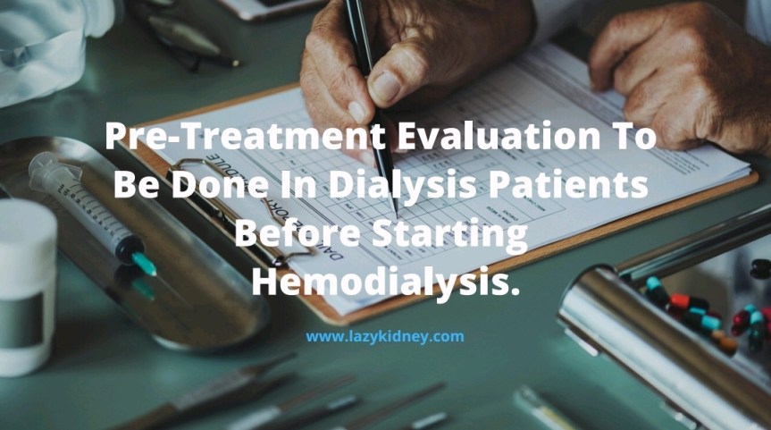 Pre treatment assessment for new dialysis patients should include: