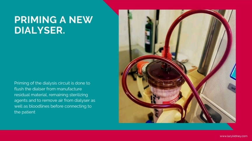 Priming of the dialysis circuit is done to flush the dialser from manufacture residual material, remaining sterilizing agents and to remove air from dialyser as well as bloodlines before connecting to the patient.