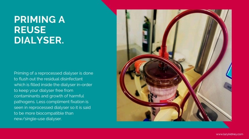 Priming of a reprocessed dialyser is done to flush out the residual disinfectant which is filled inside the dialyser in-order to keep your dialyser free from contaminants and growth of harmful pathogens. Less compliment fixation is seen in reprocessed dialyser so it is said to be more biocompatible than new/single-use dialyser.