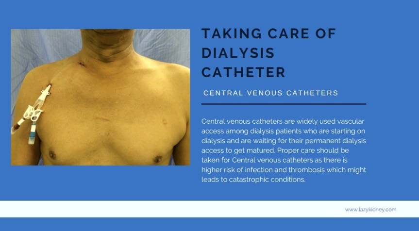 Dialysis catheters are also called as Central Venous Catheters (CVC). CVC are widely used vascular access among dialysis patients who are starting on dialysis and are waiting for their permanent dialysis access to get matured. CVC is a synthetic tube usually placed in a vein in the neck or groin or chest.